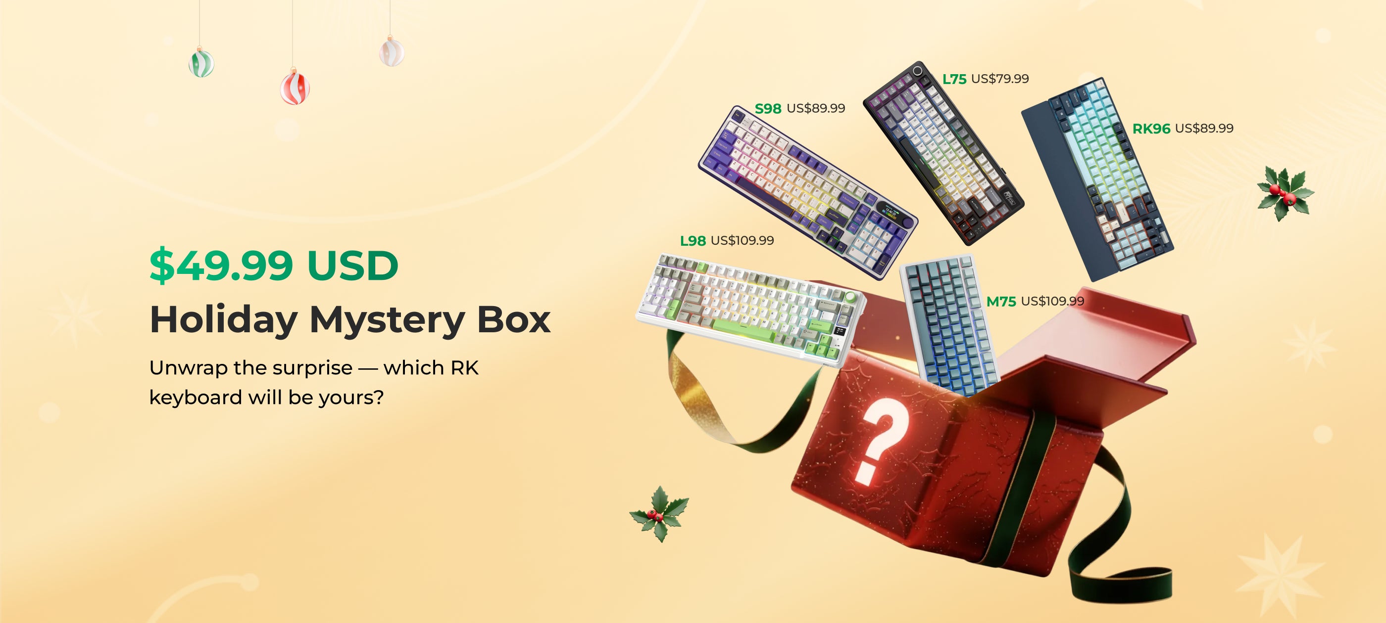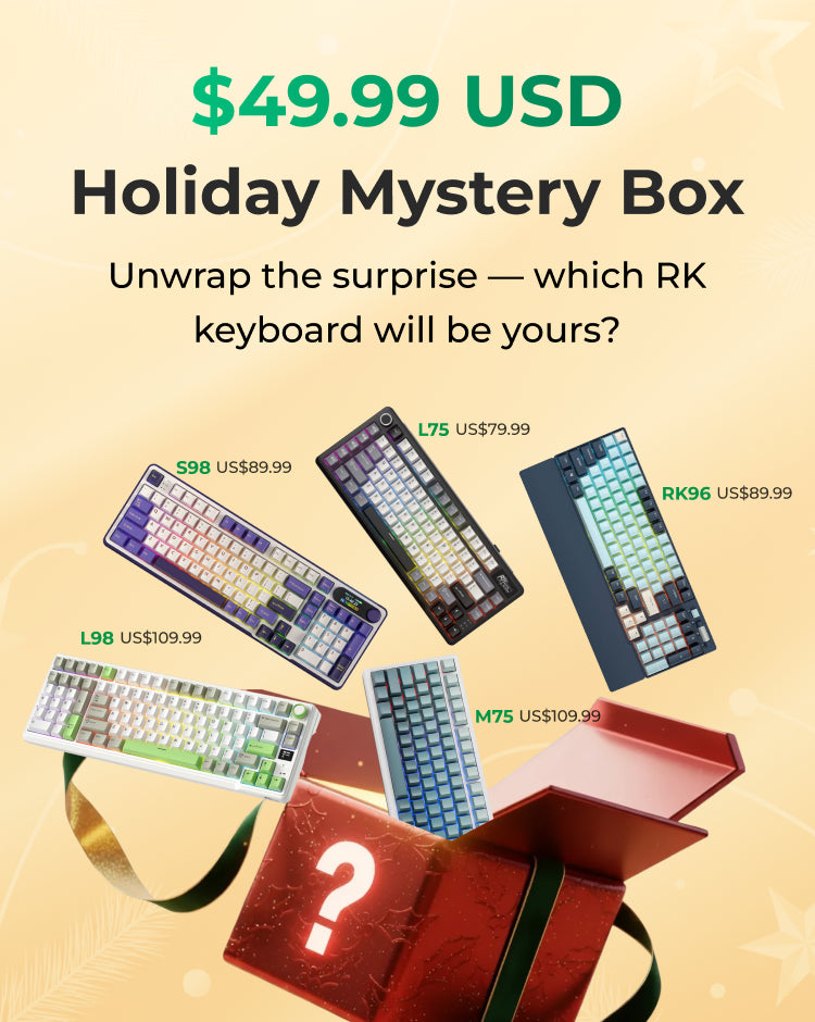 Holiday Surprise Box!! Treat yourself to a festive mystery keyboard for just $49.99 USD! Each box includes one random RK bestseller — you might unwrap an S98, L75, M75, RK96, or L98, valued at up to $109.99 USD.