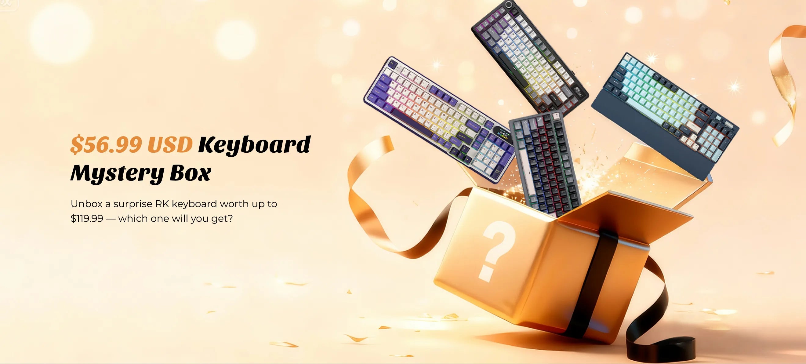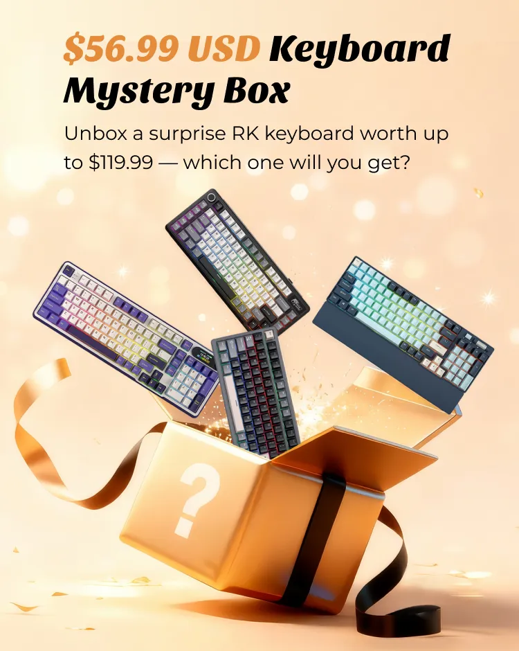The contents are a secret, but you can expect one of the higher-value RK keyboards listed below. Each Mystery Box contains one randomly selected keyboard from our hot-selling lineup — a perfect addition to your setup! If a keyboard comes in multiple colors, the color you get will be randomly assigned, adding even more surprise to your unboxing experience.